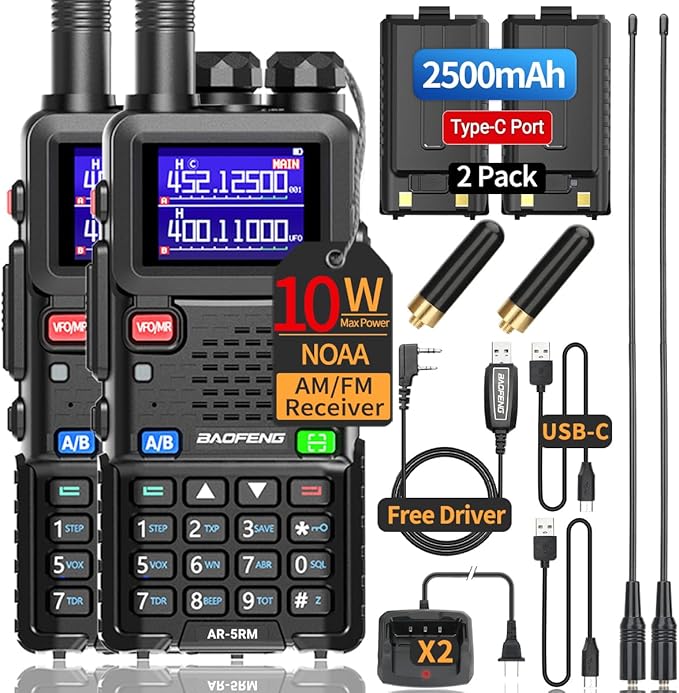 BaoFeng Radio 10W Ham Radio Long Range AR-5RM Handheld Two Way Radio NOAA Weather Receiver Rechargeable UV-5R Walkie Talkies, Copy Frequency 999CH with Type C Charging 2500mAh Battery (2 Pack)