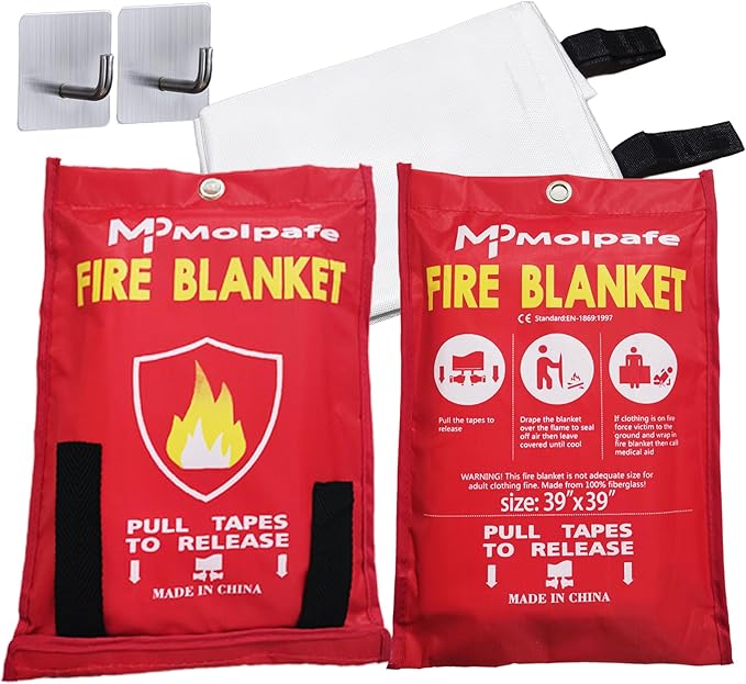 Emergency Fire Blanket, 2 Packs 39"x39" Suppression Flame Retardent Safety Blanket, Fiberglass Fire Blanket, for Home, Kitchen, School, Office, Car, Fireplace, Grill, Camping -with Hooks -001