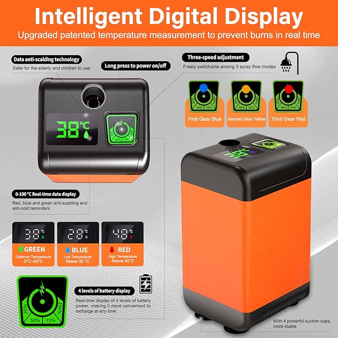 - 【Easy Assembly and Operation/Compact and Protable】12VF powerful motor, power increased by 3-4 times, higher water pressure; hold the switch on battery pack for over 3 seconds to start the pump. Equipped with a 3 selected modes shower head and water stop switch, you can easily switch different modes by rotating the handle on the shower head panel. Provided suction cup can fix the shower head on any smooth flat surface. Hook lets you hang the showerhead safely on trees for a convenient shower.