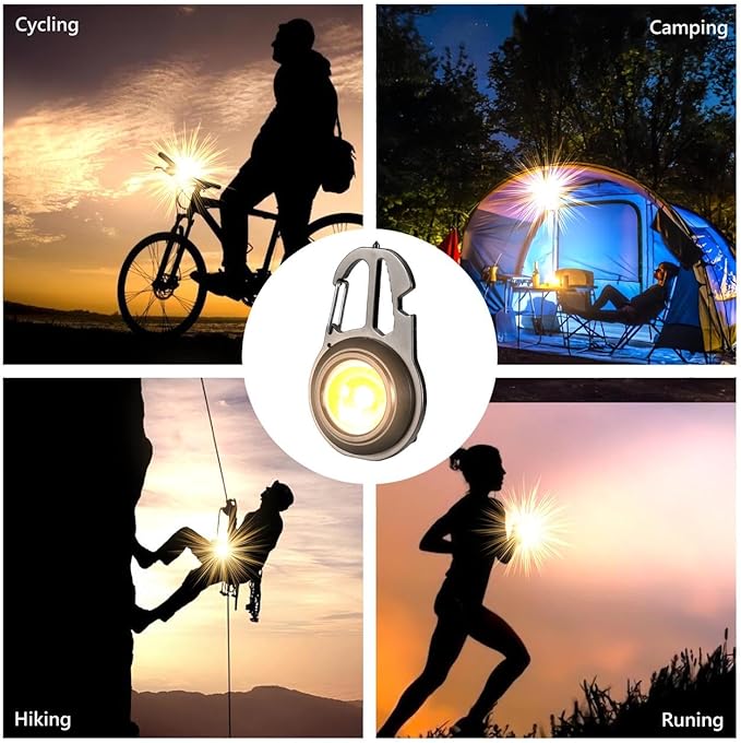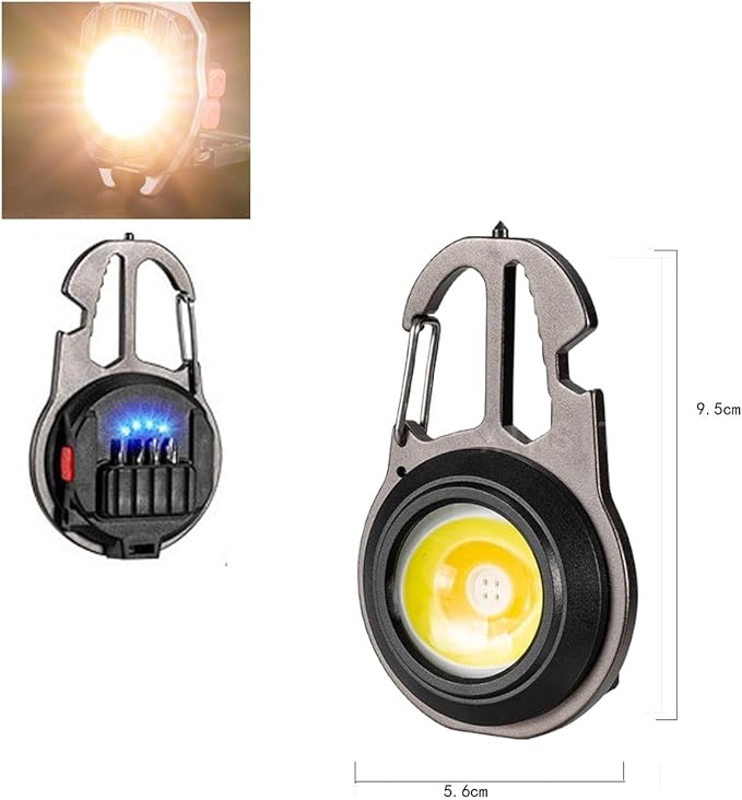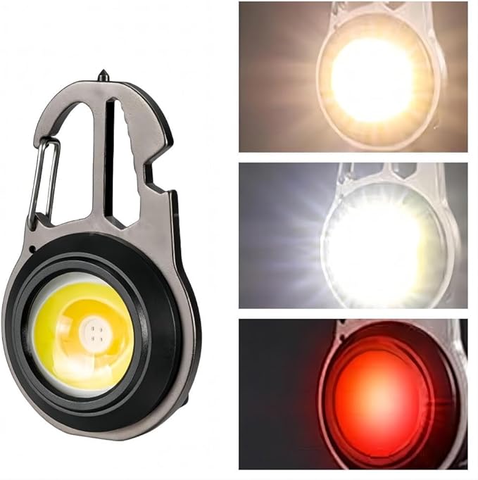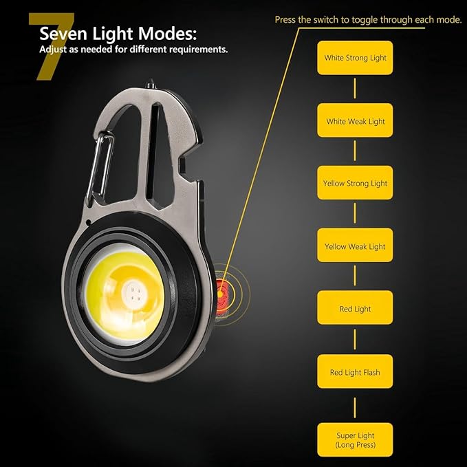 - Lighting Modes:Choose from various lighting options – white light at 70% and 30% brightness, yellow light at 100% and 30%, red light, and flashing red. Hold for 2 seconds to activate 100% white light –This COB keychain light is perfect for warning signals.