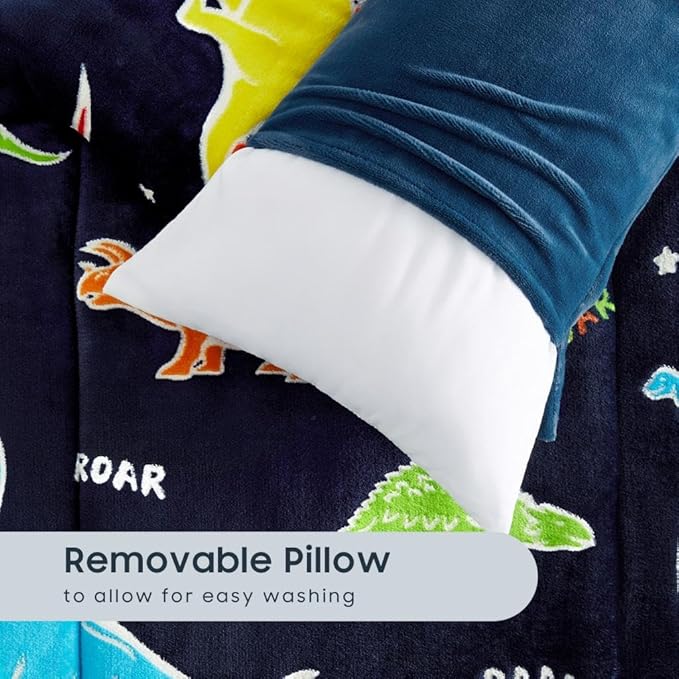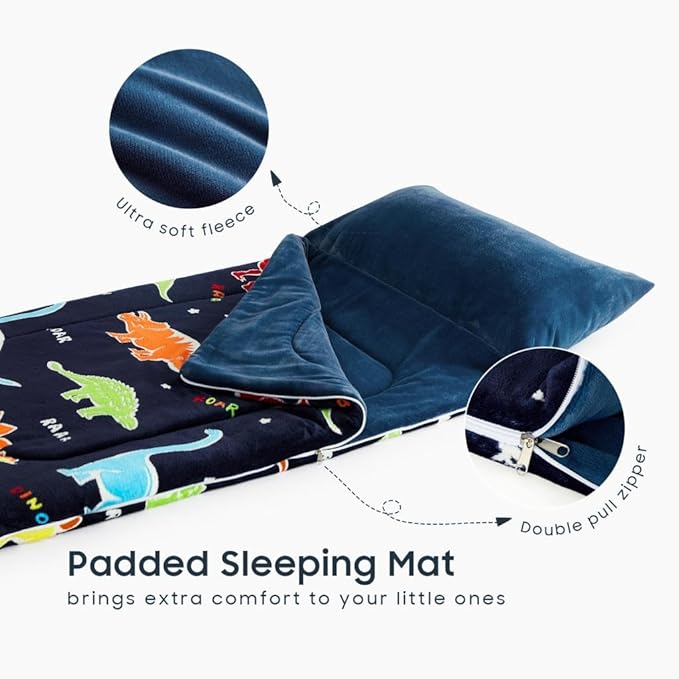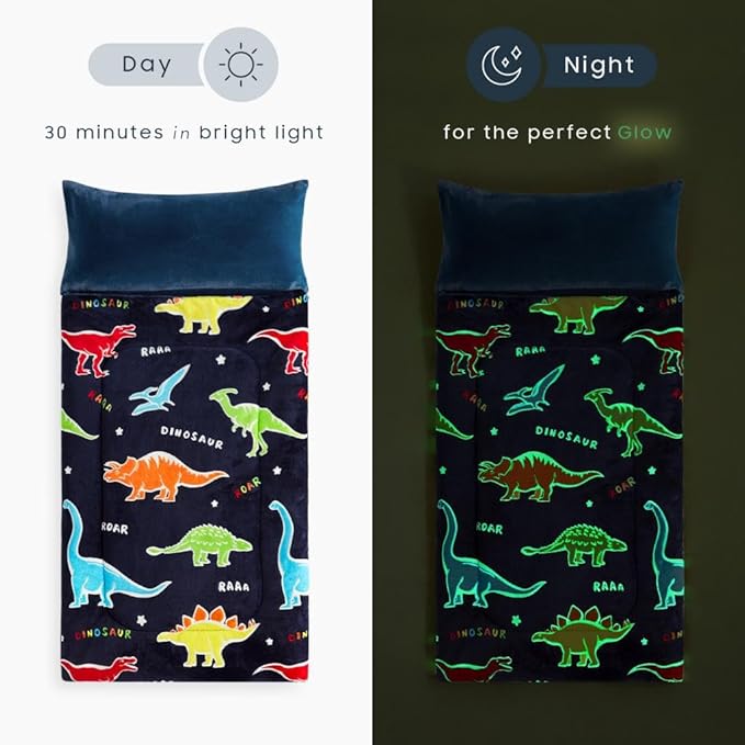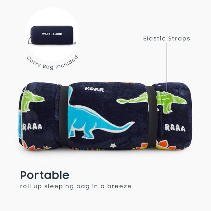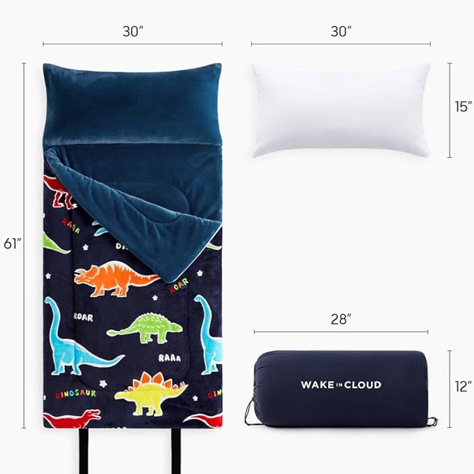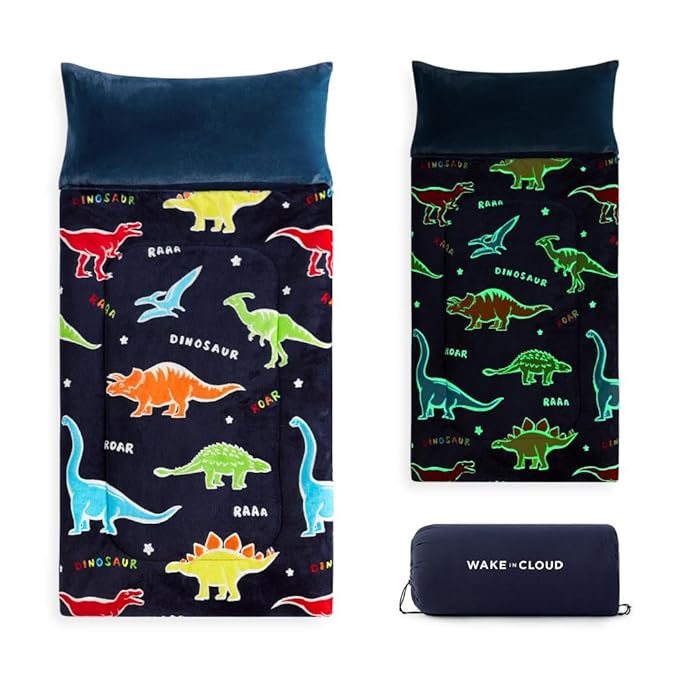 Wake In Cloud - Glow in the Dark Sleeping Bag with Pillow, Fleece Nap Mat for Toddler Kids Boys Girls, Winter Cold Weather Daycare Kindergarten Sleepover Travel Camping, Colorful Dinosaur on Dark Navy