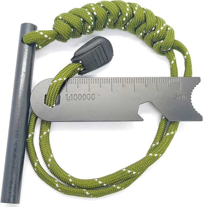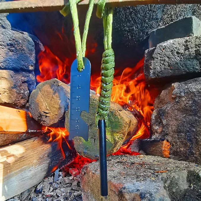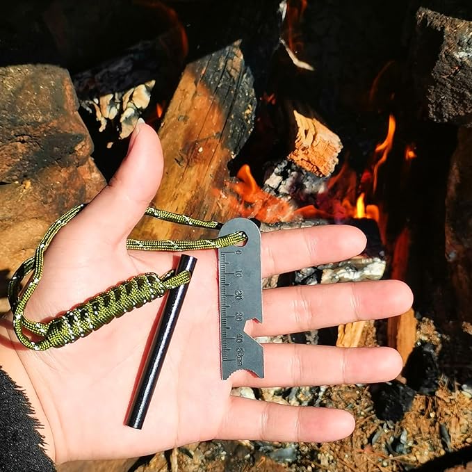 - 【You Will Get】Our flint and steel fire starter includes a 5/16" thick ferro Rod, 1 pcs umbrella rope and a multipurpose 6-in-1 flint striker scraper, that can be used as a ruler, bottle opener, hex wrench, map scaler and tinder scraper.