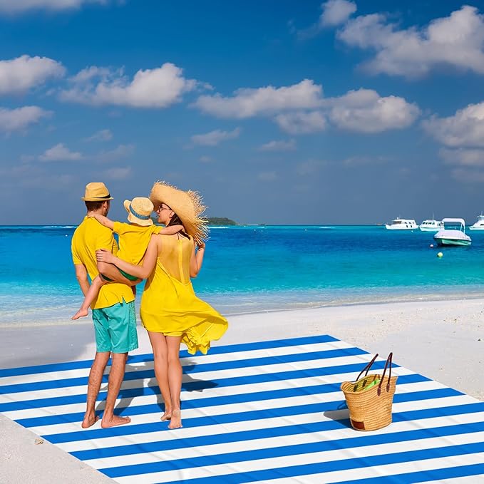 Blue Stripe Beach Blanket Sandproof Waterproof, Extra Large 78"×86" Beach Mat for 1-4 Adults w/Stake & Pocket,Compact Lightweight Sand Free Picnic Mat Beach Essential-Ultra Marine