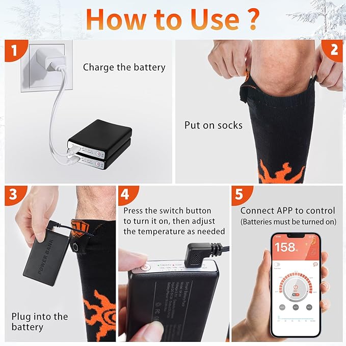 - 【𝐂𝐨𝐦𝐟𝐨𝐫𝐭𝐚𝐛𝐥𝐞, 𝐖𝐚𝐫𝐦 & 𝐔𝐬𝐞𝐫-𝐟𝐫𝐢𝐞𝐧𝐝𝐥𝐲】Our heated socks creatively blends heating wire and fabric perfectly, besides being comfortable, nice touch,and warm, you will not feel the heating elements.With soft breathable and stretchy with excellent cushioning material,the rechargeable heated socks are a nice thickness that isn't too thick or too thin, so they will not bunch up or cause chafing. Compact & slim battery with streamlined design,can be put into a pocket, is secure.