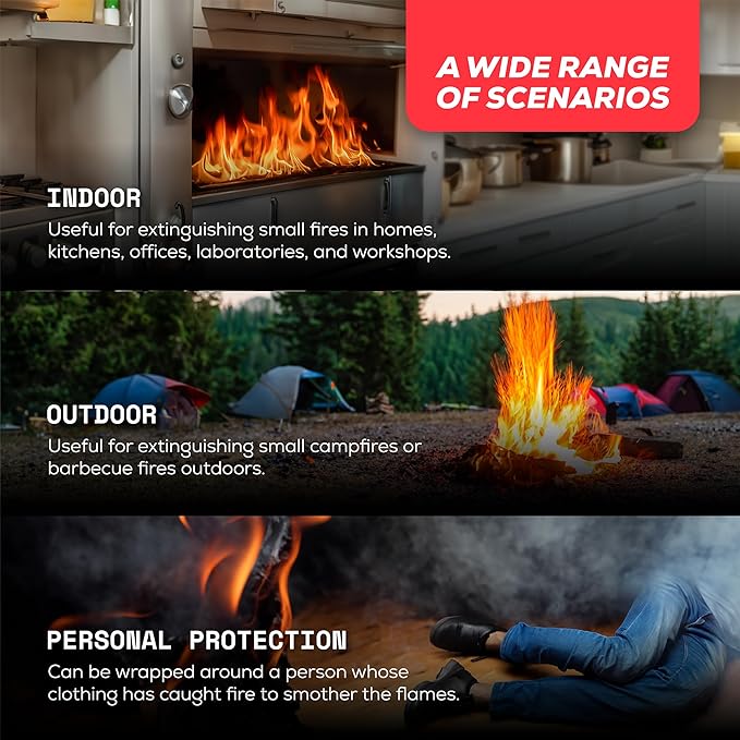 - Versatile and Lightweight: Our lightweight fire suppression blanket effectively tackles liquid, grease fires, and various other types of fires. It can also function as a thermal or heat shield. An indispensable addition to your kitchen, backyard, emergency disaster preparedness kit, prepper gear, vehicle survival kit, and camping essentials.