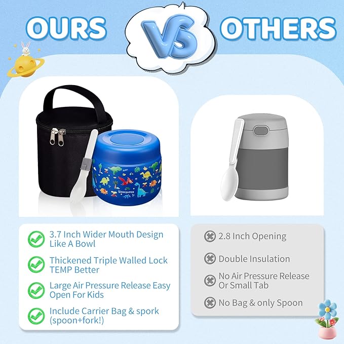- 3.6 INCH WIDER MOUTH THAN OTHERS: Considering convenience, our kids food thermo box is EXTRE WIDE mouth design, which allow you easy eating straight from the container. And easy to clean, you can also put insulated food container in the dishwasher, but washing by hand is recommended to extend the life of the product.