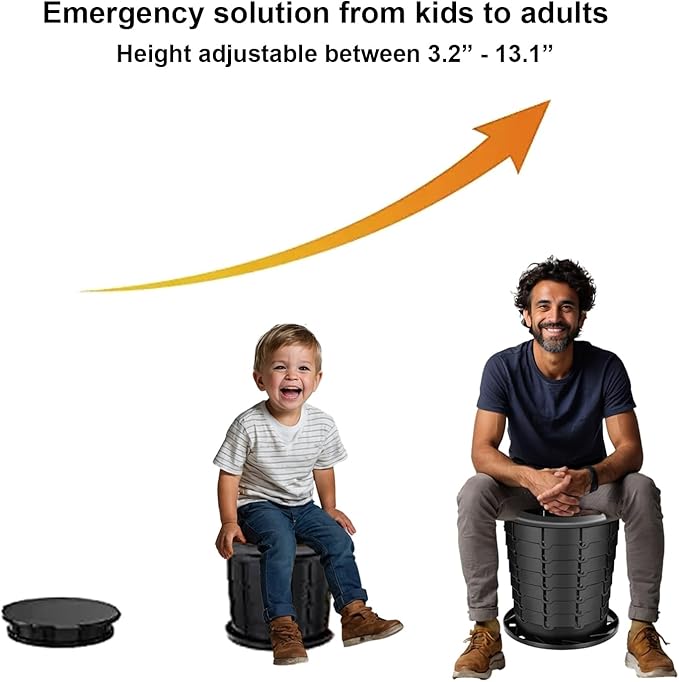 - ADJUSTABLE HEIGHT PORTABLE TOILETS FOR ADULTS AND KIDS: Folded to merely 3.25” tall, this height adjustable bucket toilet can be extended to more than 13” which is convenient for both adults and kids.
