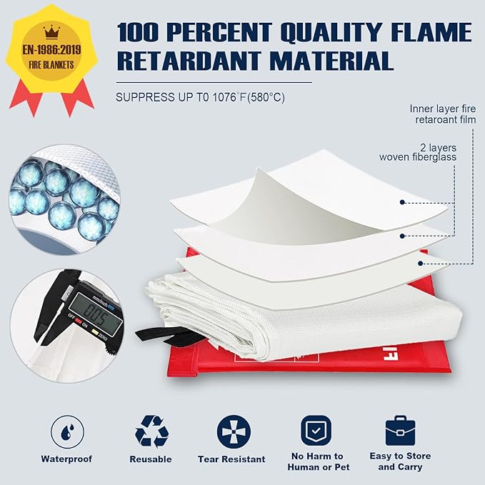 - HIGH QUALITY FLAME RETARDANT MATERIAL: Fire blanket crafted from two layers of 100% flame-retardant woven fiberglass fabric with an inner fire-retardant film. Emergency Fire Blanket is made of pure new glass fiber, which can isolate high temperatures up to 1076℉ (580°C) and has strong fire resistance.