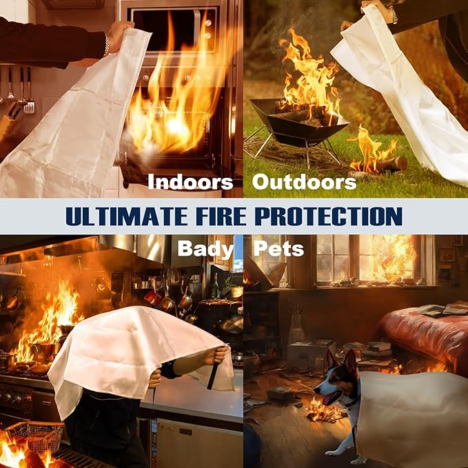 - ALL TYPES OF FIRES: The fire protection blanket can effectively extinguish almost all types of fires, including electrical, cooking oil, textiles, petrol/diesel, paper/card, motor oil, and bio-ethanol. It can also be used to cover the body for fire survival. It is suitable for families, camping, cars, boats, offices, schools, warehouses, and other places.