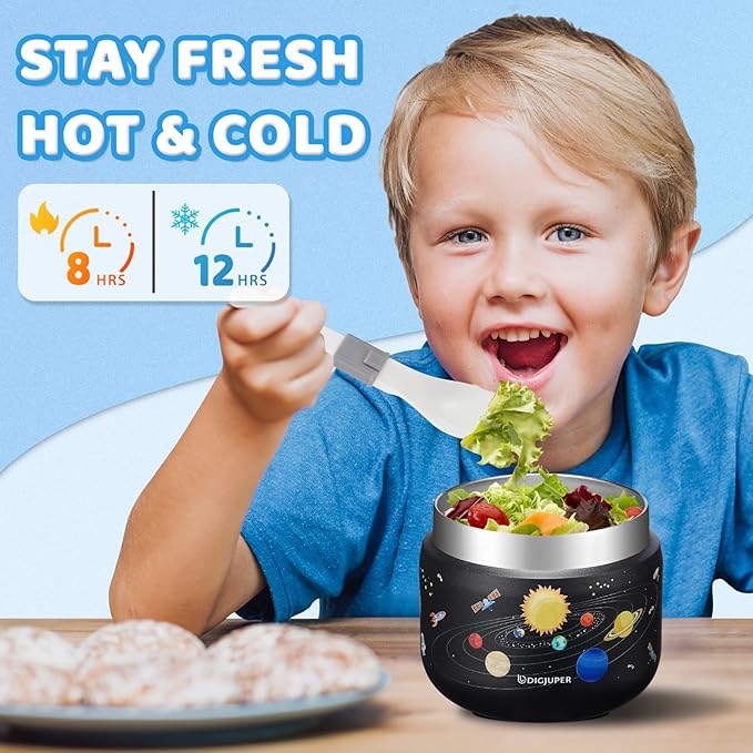 - TRIPLE-INSULATION & BPA-FREE: This attractive & practical insulated food jar features triple-wall vacuum insulation and 18/8 stainless steel, keep your lunches, soups or pasta HOT for up to 8HRS or COLD for up to 12HRS without altering the taste and keeping food tasting fresh, making it the perfect thermal lunch box for kids, taking to school.