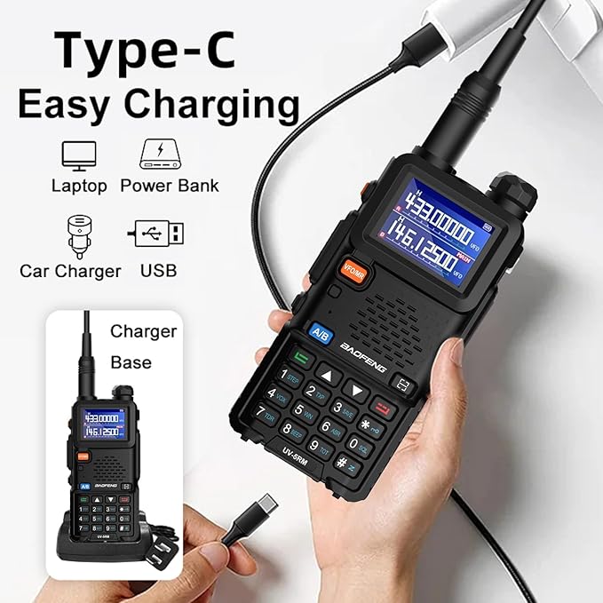 - The convenient Type-C charging port on the back of the battery allows you to charge your walkie talkie anytime, anywhere – be it in your car, using a power bank, laptop, or any USB interface device, alleviating battery life concerns during your adventures