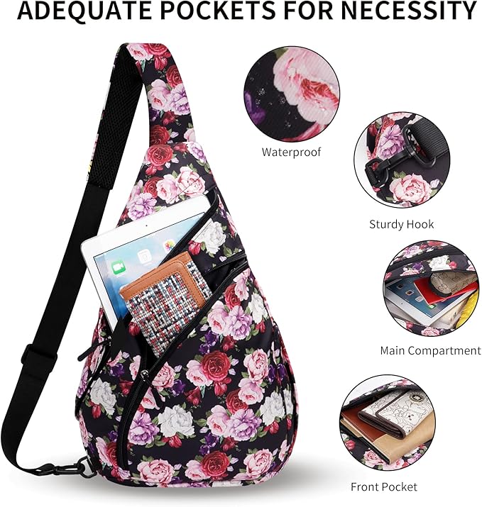- LARGE CAPACITY & MULTI-COMPARTMENT DESIGN--Featuring 4 spacious pockets, this sling bag can hold all your essentials: 1*Main pocket, 1*Front pocket, 1*Back pocket, 1*Side pocket. Perfect as a travel sling bag or everyday sling bag for city commutes.