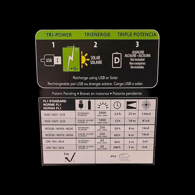 - - 3 lighting levels - Waterproof - Built-in USB and USB-C ports - Battery not included Power