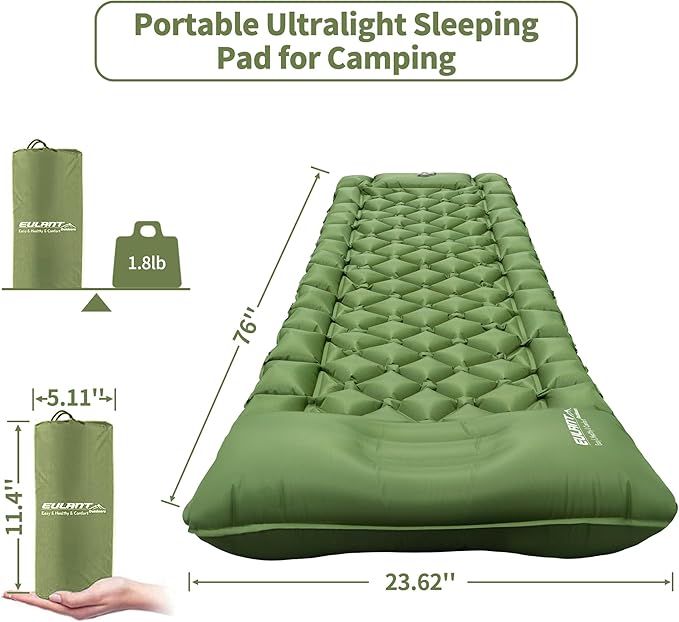 - ⛺️【Lightweight and Portable】Weighing only 1.8 lbs, our single sleeping pad is incredibly lightweight and can be easily compressed into a compact size of 11.4 x5.11 x5.11inches. Plus, the ergonomic one-piece pillow eliminate the need for carrying extra ones, further enhancing its portability. It fits easily into your backpack, you can take it with you wherever you go camping, backpacking, hiking, mountaineering, traveling, car trips, or for guests at home.