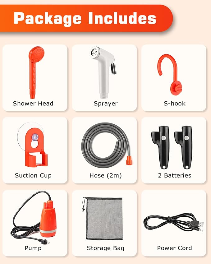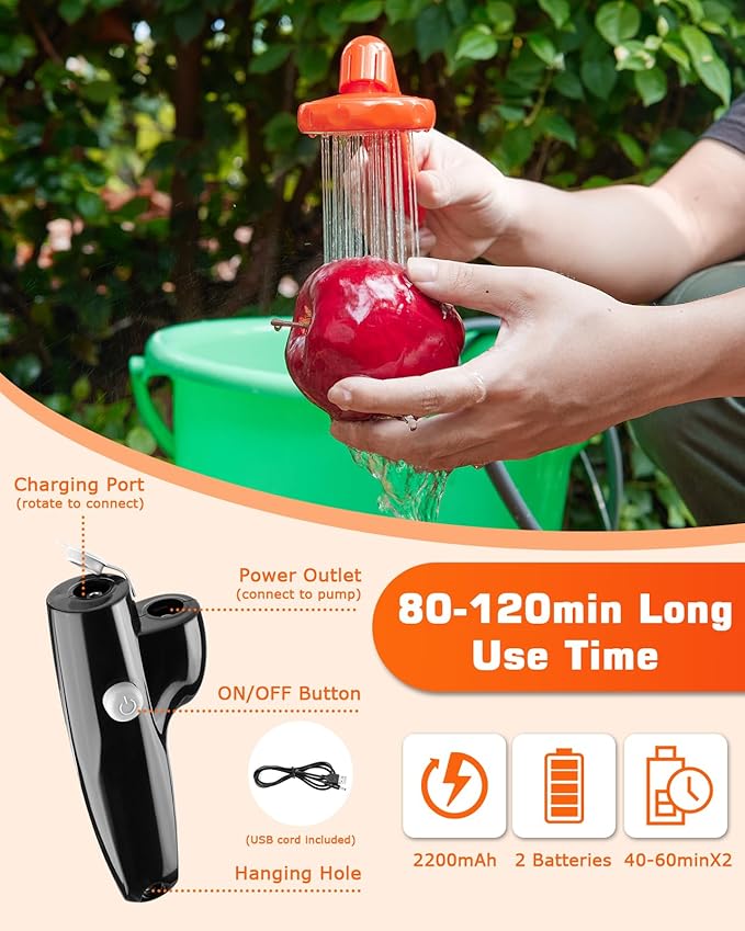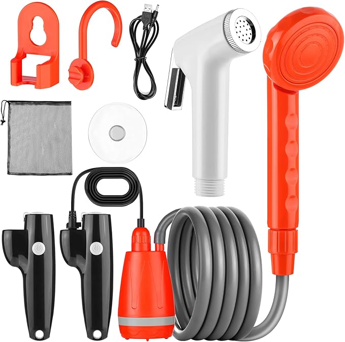 - 80-120Min Usage Time: Equipped with 2 batteries, enjoy up to 120 minutes of continuous operation for uninterrupted outdoor portable shower. USB cord charging ensures convenient recharging