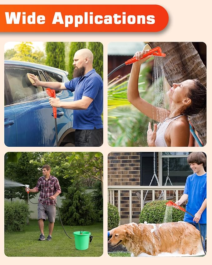 - Versatile Shower Options: Two interchangeable heads offer flexibility—a traditional shower head for a gentle flow and a handheld sprayer for targeted cleaning—perfect for car washing,RV camping, hiking, beach cleaning, pet cleaning, plant watering and more