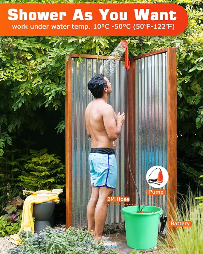 - Convenient Setup & Use : Simply submerge the pump fully in the bucket/bath, switch on the motor and it will pump the water out of the bucket to create a steady, gentle shower stream for a refreshing shower.Hassle-free assembly with an S-hook for hanging, suction cup for stable mounting, and quick water stop mechanism for efficient conservation during outdoor shower sessions