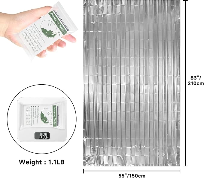 - 【Easy to Carry】Each 55''x 82'' emergency blanket is folded, wrapped, and sealed in the small bag. These silver and gold reusable blankets can be used as rain poncho, emergency tent, shelter, light duty tarp, sheets, bivy, sleeping bag, windows insulation, signal mirror, and other creative applications.