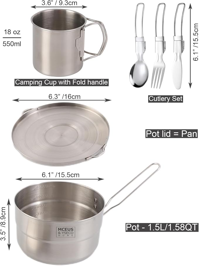 - Designed for 1~2 person, this camping cookware mess kit includes: 1x 1.58QT/1.5L Camping Pot, 1x pot lid(can be used as a pan), 1x Camping Cup 18oz, 1x set of folding Camping Utensils, included: Fork, Knife, Spoon, 1x storage bag for cutlery, 1x mesh bag for the whole Camping set.