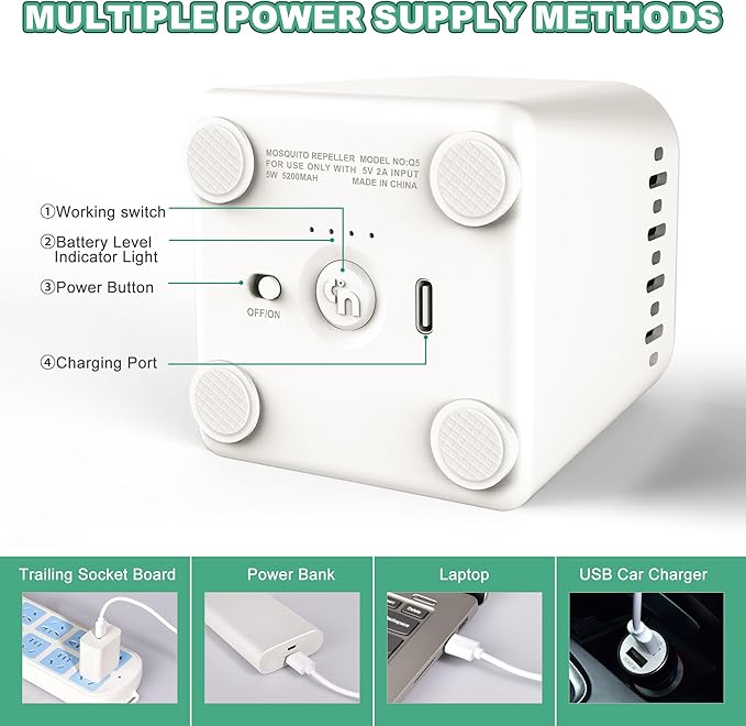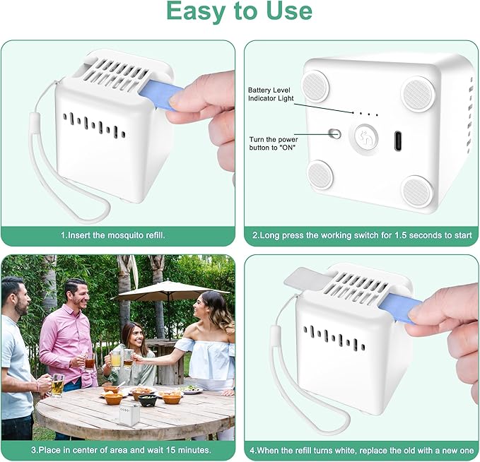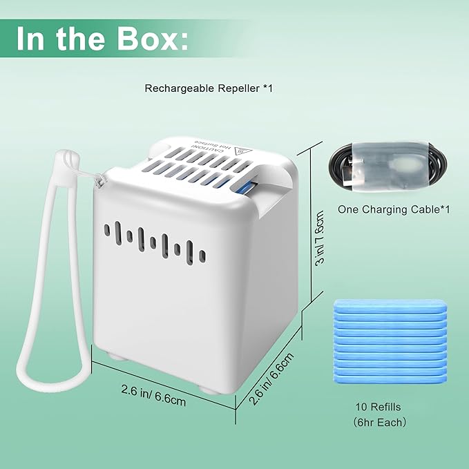 - 【HEAT-ACTIVATED TECHNOLOGY】This Outdoor Mosquito Repellent is Powered by a safe rechargeable battery. It provides 4 hours of continuous mosquito protection on a charge and fully charged in 4 hours. Type-C charging cable included. Wait for 15 minutes to achieve full effect.