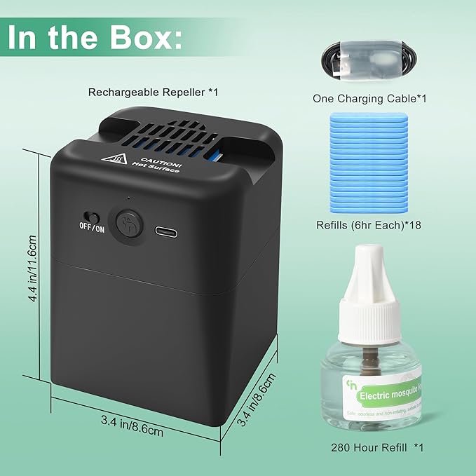 - 【LONG-LASTING DEFENSE】 Q5 Indoor Mosquito Repellent provides up to 108 hours of continuous mosquito protection. Our package includes 18pcs mosquito repellent refills and 1 bottle of 45ml another repellent refill. Each piece repellent refill lasts up to 6 hours and one bottle repellent refill lasts up to 280 hours.
