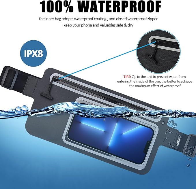 - đăIPX8 100% Waterproof&MultifuctionăOur waterproof belt bag is made from high quality,durable,water resistant&scratch-resistant nylon material with waterproof coating.Super waterproof seal performance IPX8 waterproof up to 32 feet (10 meters) underwater for one hour! Not only perfect for running,hiking,camping,workout,walking,travelling in every life,but also fit outdoor water sports,swimming,beach,boating,snorkeling,kayaking,sailing,paddle surfing,rafting,water slides,pool water park,fishing