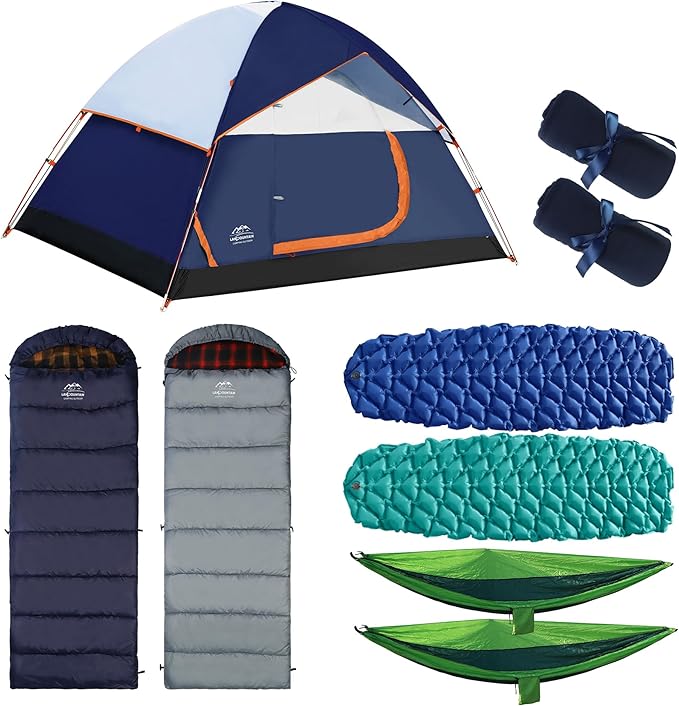 - 🏕️ Complete Camping Set: The LANMOUNTAIN 9 Pcs Camping Set is a comprehensive package that includes everything you need for a memorable outdoor adventure. It consists of 1 camp tent, 2 sleeping bags, 2 hammocks, 2 sleeping pads/camping mats, 2 single camping hammocks with 2 tree straps, and 2 lightweight fuzzy bed blankets.
