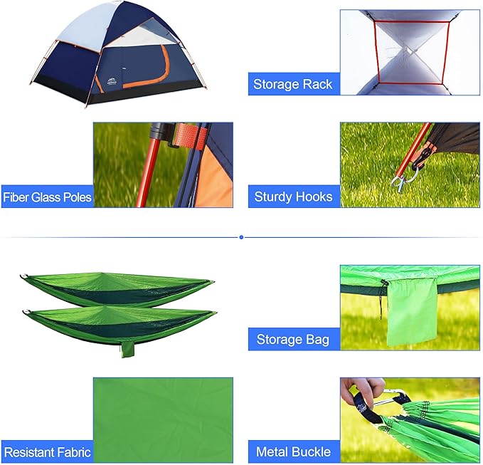 - 👍 Premium Quality and Durability: Each component of this camping set is crafted with top-notch quality materials to ensure long-lasting performance. The tent is made of waterproof and tear-resistant fabric, while the sleeping bags and hammocks are designed for comfort and durability in outdoor conditions.