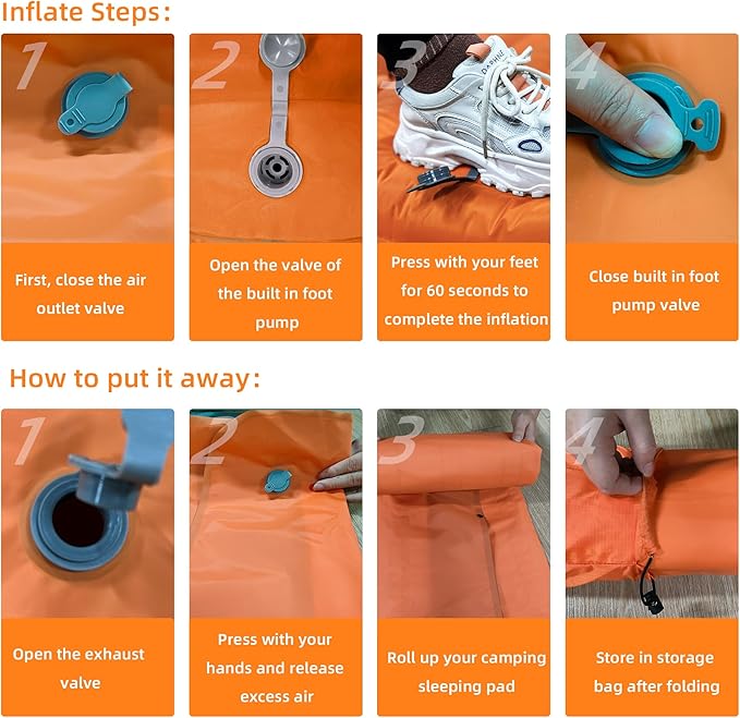 - 🏔️【Easy Inflate and Deflate】No more blowing your air mattress camping with your mouth! It has a built-in foot pump that allows you to inflate it in less than 50 seconds. Just open the deflation valve and the air will be deflated in 1 second. You can adjust the hardness of the mat by adding or releasing air as you like.