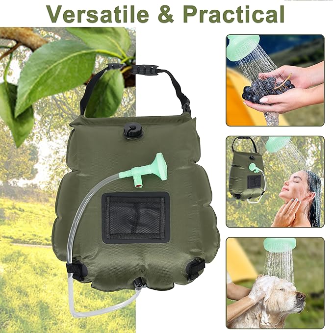 • 【Upgraded Adjustable Shower Head】Our camping shower bag comes with an upgraded shower head for easy on/off control, offering a range of water flow adjustments from low to high. With a simple turn of the knob, it meets various outdoor showering needs, enhancing your camp shower bag experience.