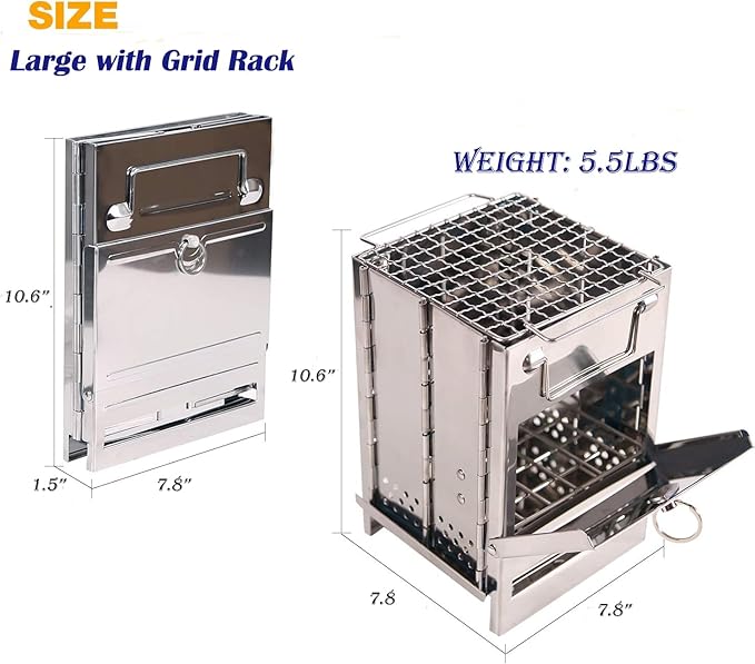 Folding Camp Stove Foldable Camping Stove Folding Stove Camp Stove Wood Burning Rocket Portable Backpacking Stainless Steel Light Folding Stove for Outdoor Hiking Camping (Large with Grid Rack)