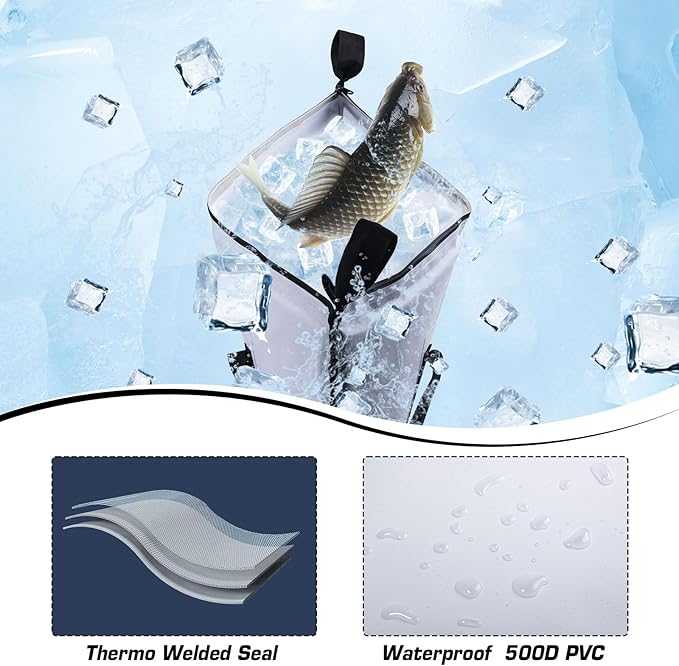 - 【Keep Fish Fresh All Day】Our insulated fish cooler bags are designed to keep your catch cool and fresh for up to 24 hours. Crafted from heavy-duty 500D PVC material with cotton-foamed insulation, these fish cooler bags are built to last. Its excellent leak-proof and waterproof performance will hold ice longer and keep catch fresh all day long.