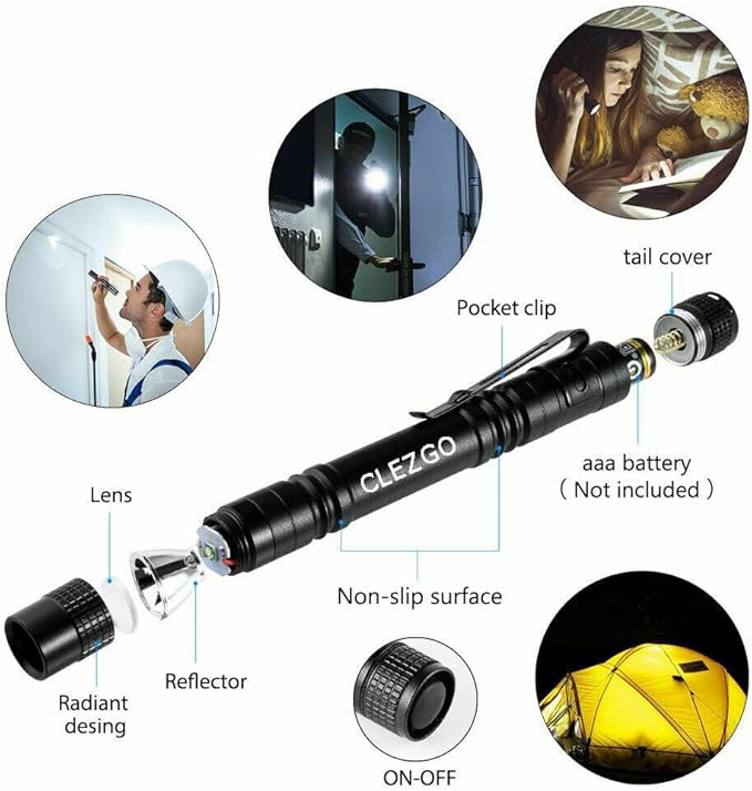 - Brighter & Clearer:Light up concentrated areas with the bright, diffused beam on this pen flashlight illuminate hard to see work areas, making it ideal for close-up tasks.it powered by 2 standard AAA batteries. (Batteries are not included)