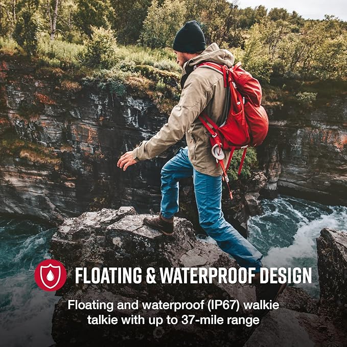 - Floating & Waterproof - (IPX7) rated two-way radios with up to a 37-mile range. Buoyant design and bright orange core makes retrieving your radio if dropped in water easy. Included headset is protected against dust and water splashes from all directions.