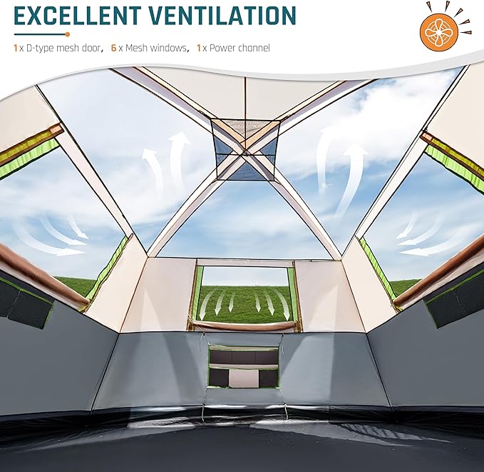 - Water Resistance & E-Port: Our outdoor tent offers robust water resistance with a rainfly, taped seams, a tent skirt, and waterproof fabric. Plus, the rain-resistant E-Port makes it easy to access power inside the tent, keeping your devices charged and ready to use.
