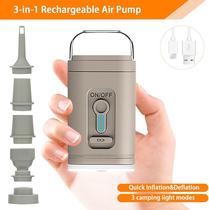 - Rechargeable Air Pump: Many customers prefer fuller mattresses, so we offer a rechargeable air pump (optional) for improved inflation and storage. Compact and portable, it boasts a built-in battery for up to 20 uses per charge, facilitating effortless inflation/deflation. With one-button operation, it inflates/deflates in under 1 minute and includes 5 nozzles for various products like air mattresses and swimming pools. Additionally, it features a camping light mode with adjustable brightness (up to 10 hours on low).