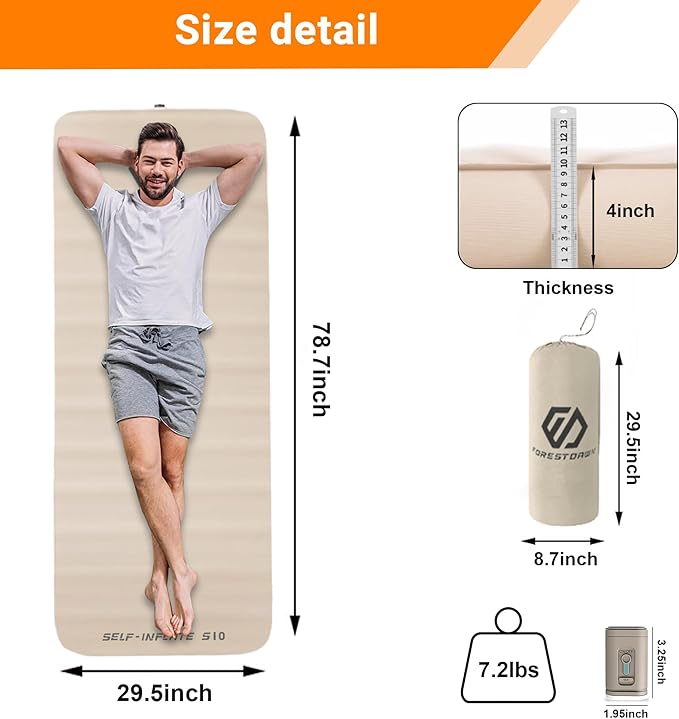 - Ergonomic thickness: Measuring 78.7"x29.5", our air sleeping mattress is spacious enough to accommodate individuals of all body types comfortably.The 4inch thickness ensures you no longer have to endure the dampness and cold of the ground. A slight increase in size yields a significant improvement in comfort. Our foam sleeping pad allows you to stretch out and truly relax after a tiring day.
