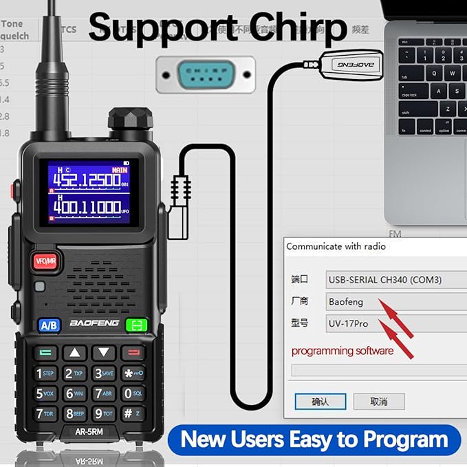 - 🌴【Long Range Professional Walkie Talkie】The communication distance can reach 3-5Mile. Featuring a sturdy casing and anti drop design, your radio can withstand harsh conditions and have a longer lifespan. FCC Certification,FCC ID:2AJGM-5RM. Support Chirp (Compatible programming software: UV-17PRO).