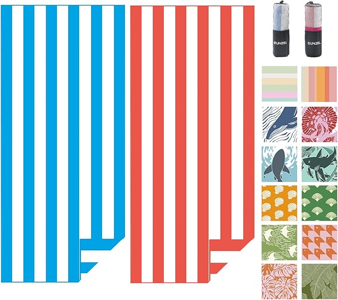 Eunzel 2 Pack Microfiber Beach Towel, Quick Dry Travel Towel Large Sand Free Towel for Beach, Camping, Swim Pool, Gym, Sports& Yoga 71"x32", Stripe Blue & Red