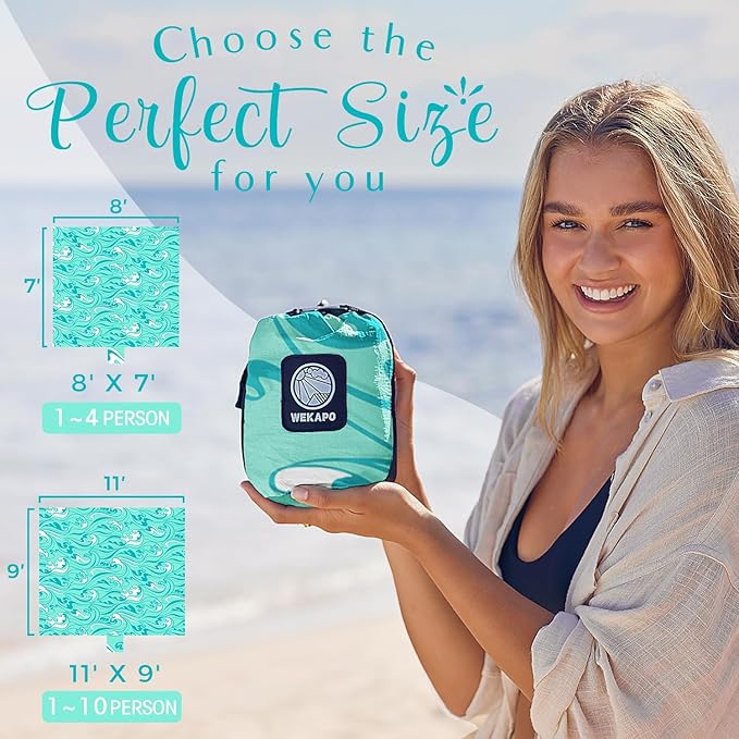 WEKAPO Beach Blanket Waterproof Sandproof Oversized Extra Large Sand Free Beach Mat with Stakes, Storage Bag - Essentials for Outdoor Beach, Picnic (Turquoise Ocean Waves, 8 X 7 FT (1~4 Person))