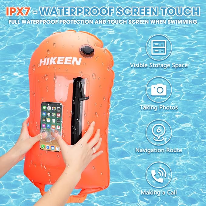 - [VISIBILITY IN OPEN WATER] The Hikeen Swim Buoy is a bright orange colour that stands out in the water and is clearly visible in open water, it's perfect for open water swimmers, triathletes or anyone else who wants to increase their confidence in the water.