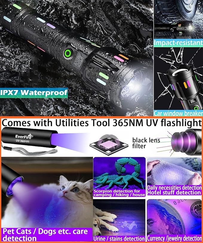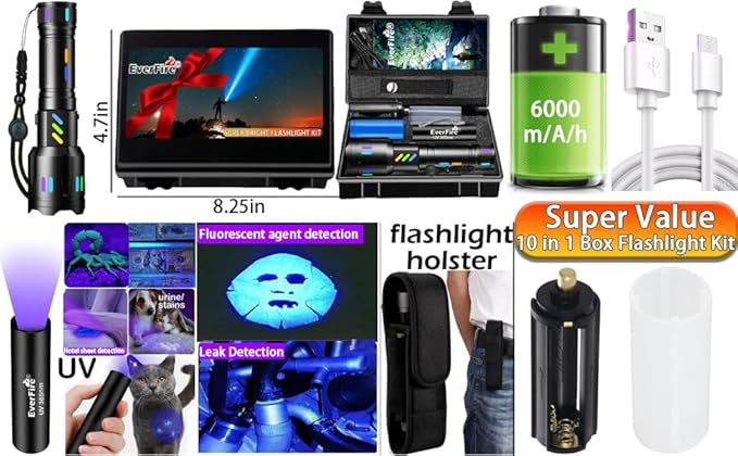 - VALUE 10 IN 1 CASE FLASHLIGHT KIT : This flash light comes with 1X EX007 flashlight, 1X 6000mÁh rechargeable battery, 1X Rechargeable 365nm black light UV flashlight, 1X Portable storage gift box, 1X USB C charging cable,1X micro USB charging cable, 1X Holster, 1X Wrist lanyard , 1X AAA battery rack holder, 1X Battery tube, 1X Users manual . We alos offer 24/7 customer support.If you have any questions, please feel free to let us know