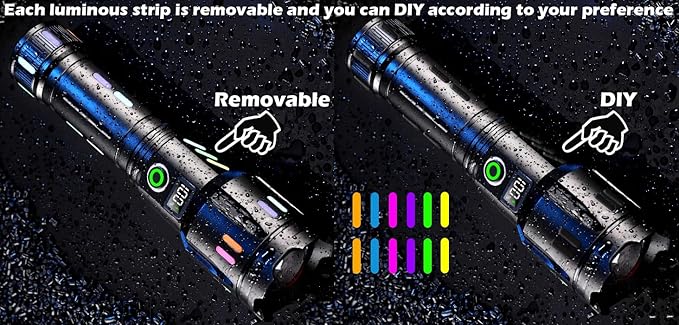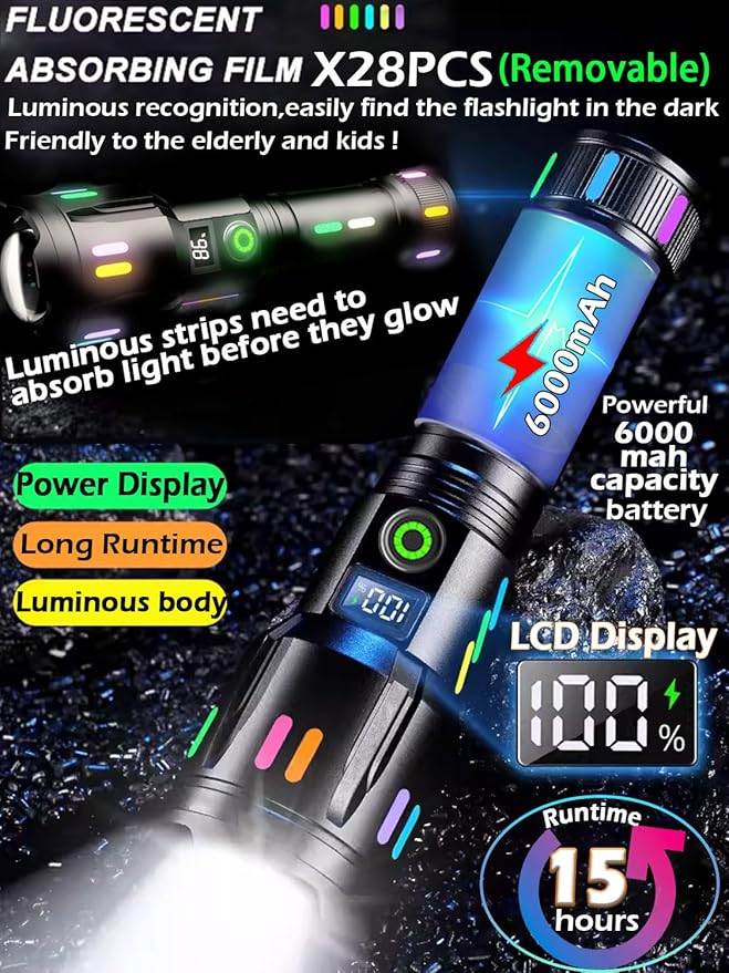 - UNIQUELY LUMINOUS BODY & ENHANCED PERCENTAGE POWER DISPLAY: Uniquely, this powerful rechargeable flashlight features 28 removable luminous strips on its body that glow in various colors in the dark, making it easily locatable when a sudden power outage or in dim outdoor conditions. It's equipped with LCD power display that accurately indicates the remaining battery life, ensuring you know precisely when to recharge. It's a MUST HAVE gear for camping essentials,hiking accessories,hurricane supplies for home,emergency survival kit ect