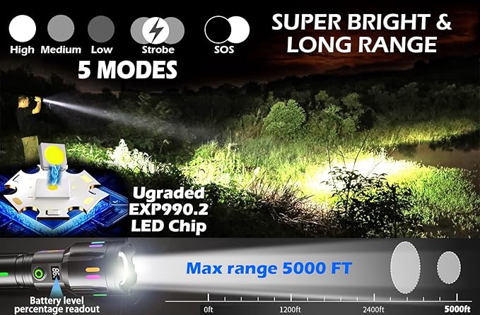 - Special Feature : High Power High Brightnetss Flashlight, Flashlight with USB C Rechargeable & Power output function, Luminous Fluorescent Strip Body Flashlight, Long Range 5000 ft & Long Runtime 15 Hours, Adjustable Focus & Adjustable Light Modes - High-Medium-Low-Strobe-SOS High Power High Brightnetss Flashlight, Flashlight with USB C Rechargeable & Power output function, Luminous Fluorescent Strip Body Flashlight, Long Range 5000 ft &… See more