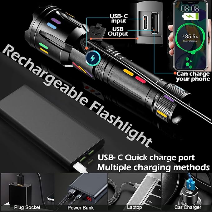 - USB C FAST CHARGING & PORTABLE MOBILE POWER FUNCTION: This tactical handheld LED flashlight features 2 USB interfaces: a USB C input for charging the handheld flashlight and another USB output for its use as a portable mobile power, it's capable of charging your cell phone, or any other USB devices,versatile and very convenient to use
