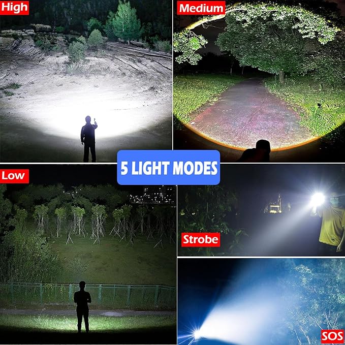 - BRIGHTEST 5 MODES & BEAM ADJUSTABLE: This high lumen rechargeable flashlight features 5 lighting settings: high, medium, low, strobe, and SOS for emergency, catering to different situational needs. You can effortlessly adjust the beam by manipulating the flash lights head, alternating between a broad beam for close-range activities and a focused beam for long-distance visibility. Long press the switch for 2-3 seconds under any mode to turn off the flash light without cycle through all modes