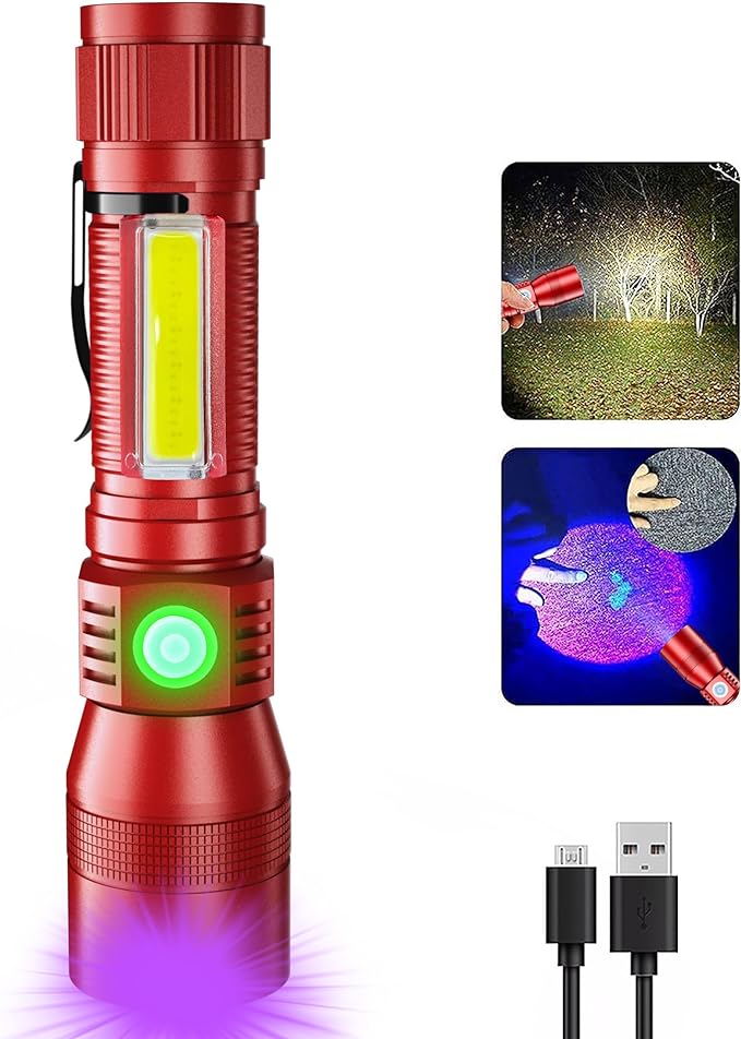- 395nm uv light with Magnetic base: With uv ultraviolet light, you can clearly see the stain watermark, pet urine, harmful insects and animals, and verify banknote documents. The led flashlight comes with a cob tool light, magnet flashlights. When two hands are required for operation, it can be attached to the metal and the cob light is used for auxiliary operation. The cob light also comes with red or red and white flashing light, which can achieve the warning effect.