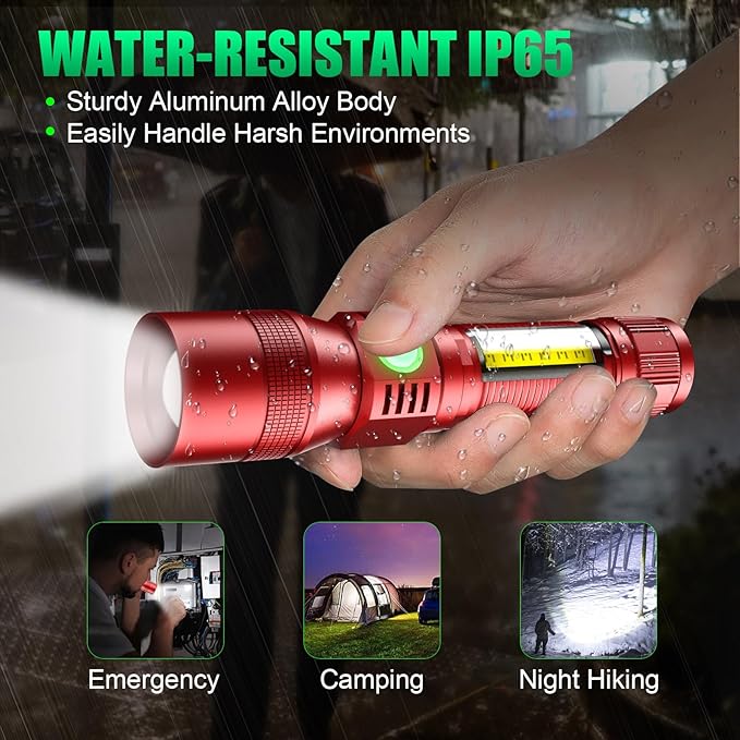 - 7 Modes, One key turn off: LED lighting is a combination of white and purple light. This product can be used for lighting or object detection. 1000 lumen that could light up to 600ft, it could be fully zoomable from large area floodlight to focus spotlight. In addition, This product has 7 different light settings, High, Low, Strobe, COB Side Whitelight, COB Redlight, and a COB White, Red flash, and High UV light. (one key turn off, You can long press to turn off the flashlight in any mode.)