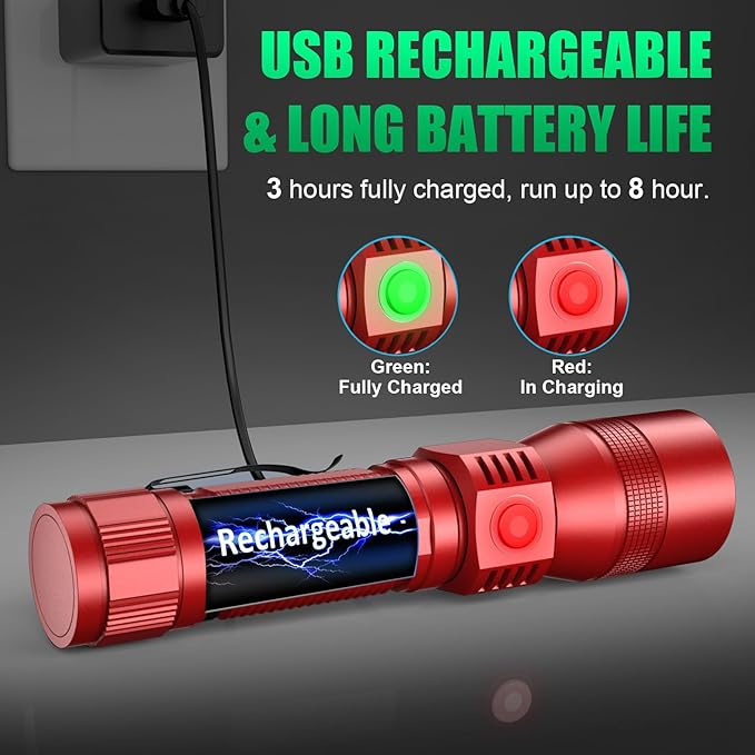 - USB Rechargeable Flashlights : Adopt large-capacity rechargeable. The flashlight can be charged by usb, or it can replace the prepared. The overall life of the flashlight is about 70,000 hours. It can be used for 8 hours after a single charge. The button will display a red light when the power is low, and a green light when the charge is complete. flashlight with UL Listed and upgrated version of overcharge protection, the flash light will stop charging when it fully charged, Safe and worry free