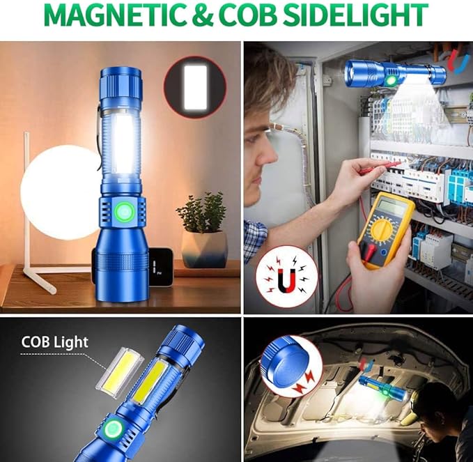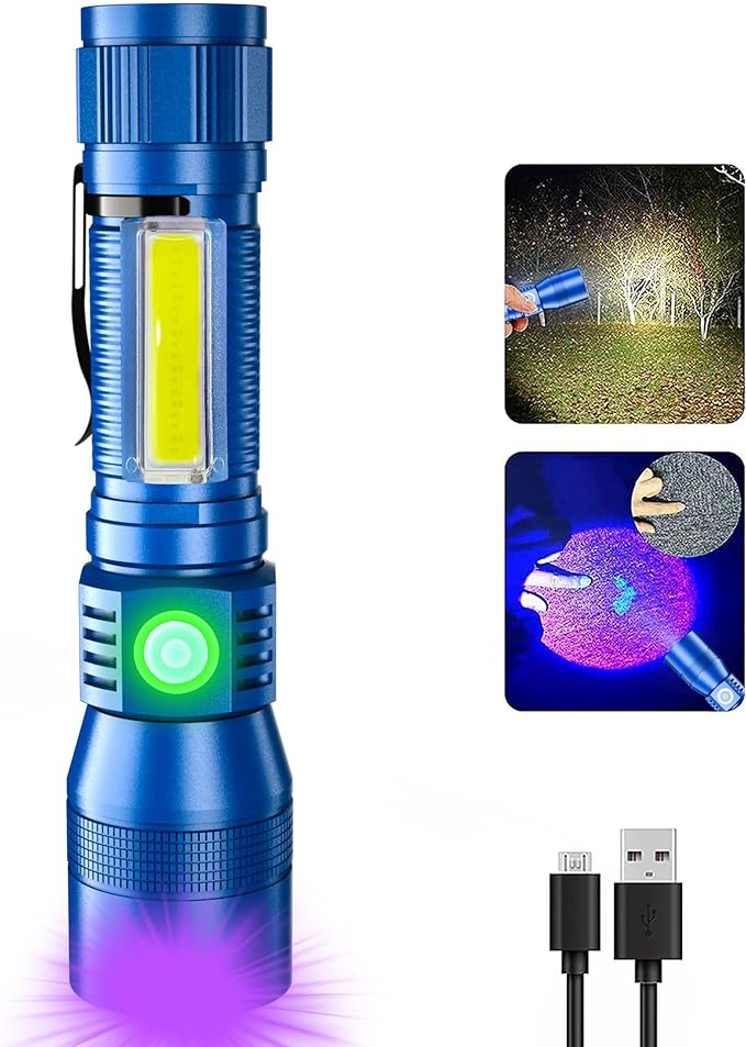 - 395nm uv light with Magnetic base: With uv ultraviolet light, you can clearly see the stain watermark, pet urine, harmful insects and animals, and verify banknote documents. The led flashlight comes with a cob tool light, magnet flashlights. When two hands are required for operation, it can be attached to the metal and the cob light is used for auxiliary operation. The cob light also comes with red or red and white flashing light, which can achieve the warning effect.